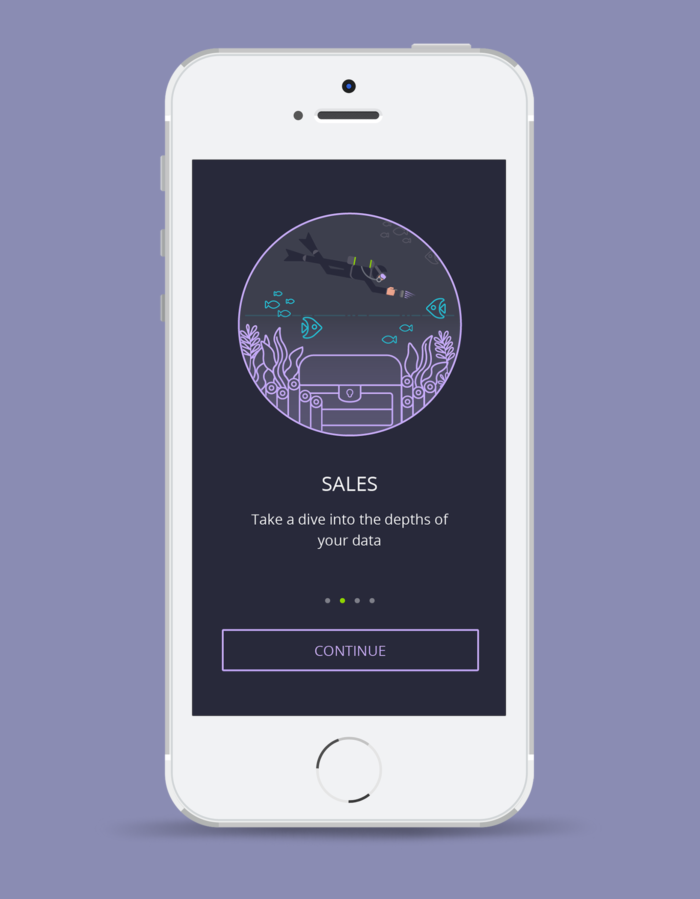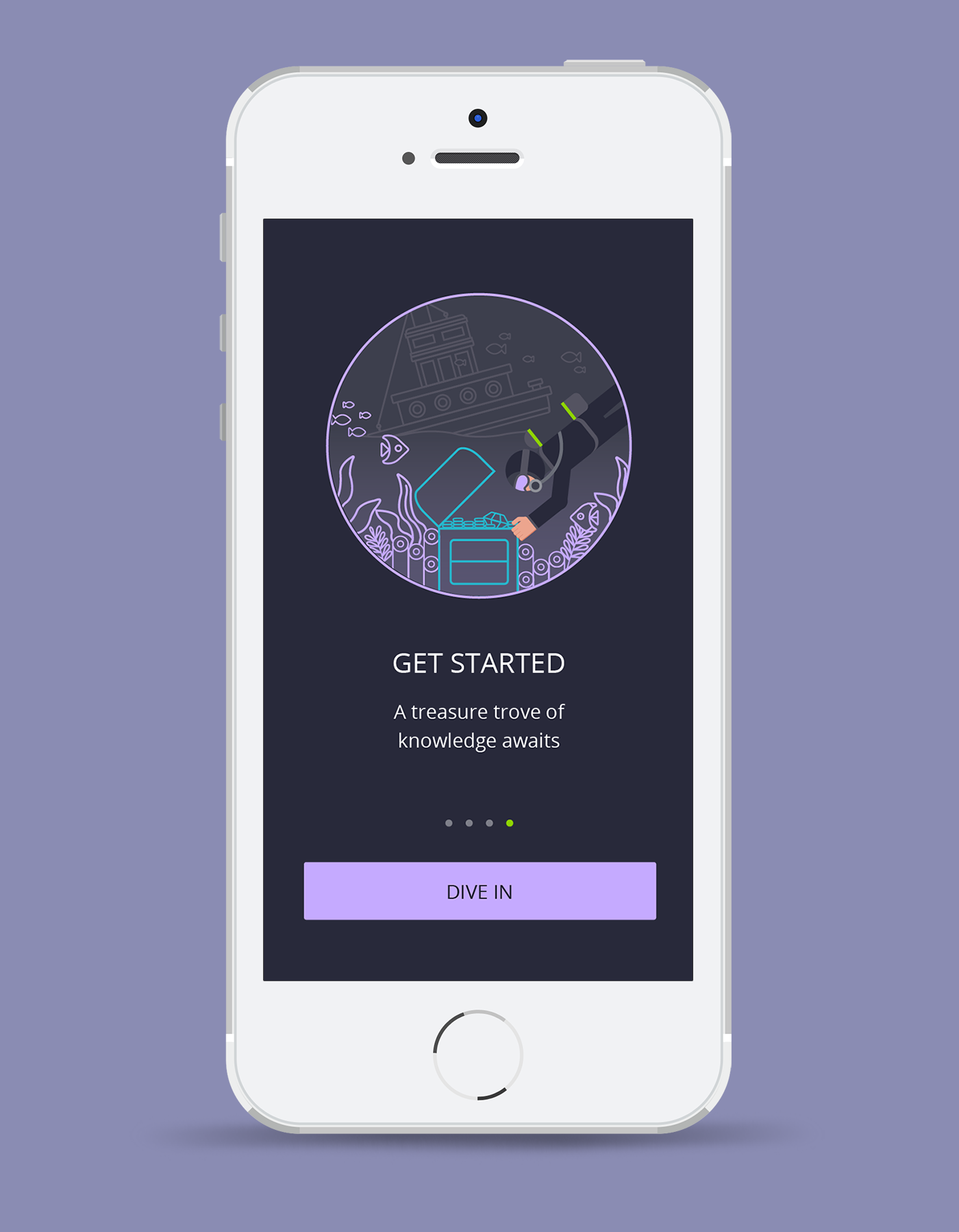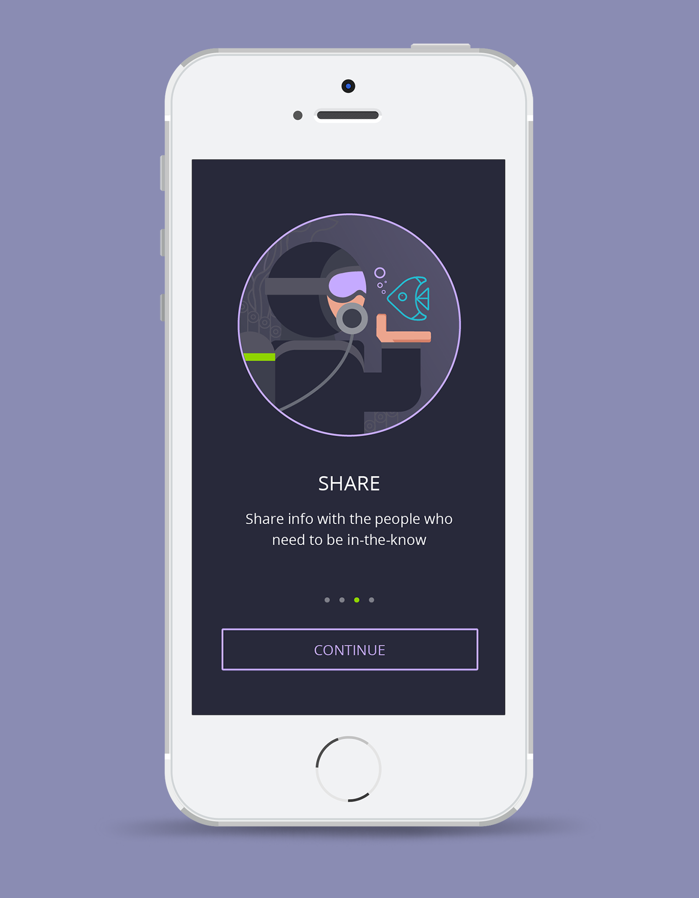 The screens I designed are meant to welcome a first time user and give them a brief overview of the sales benefits of the app. This underwater theme with line design graphics was the design put into production, as it was more universal than the more performing arts/character specific design I developed.