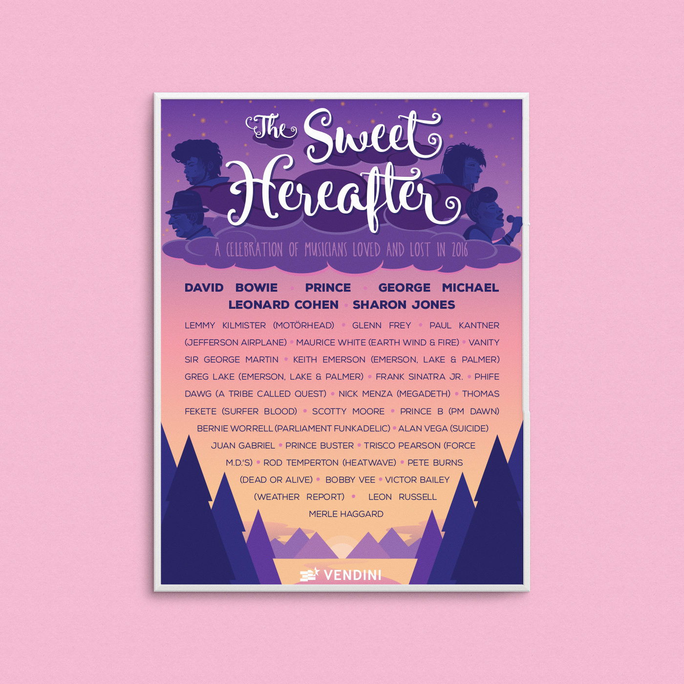 A poster designed to accompany a Vendini blog post at the end of 2016 to celebrate the musicians who passed in 2016 (there were far too many of them).